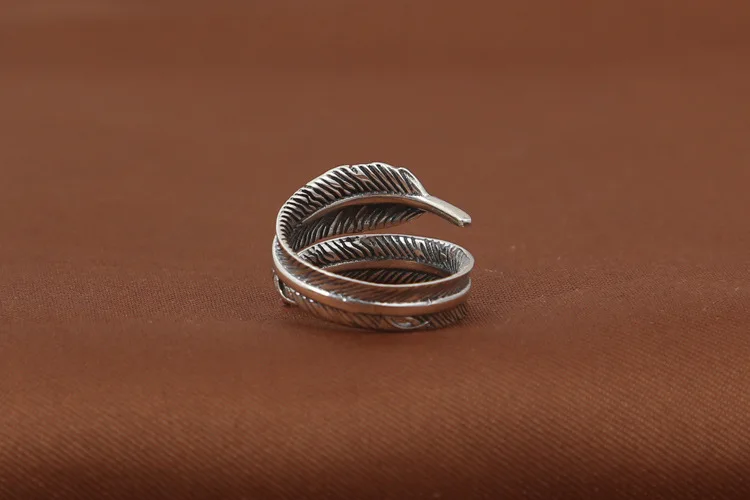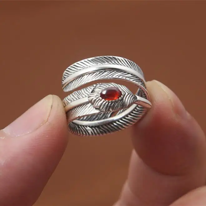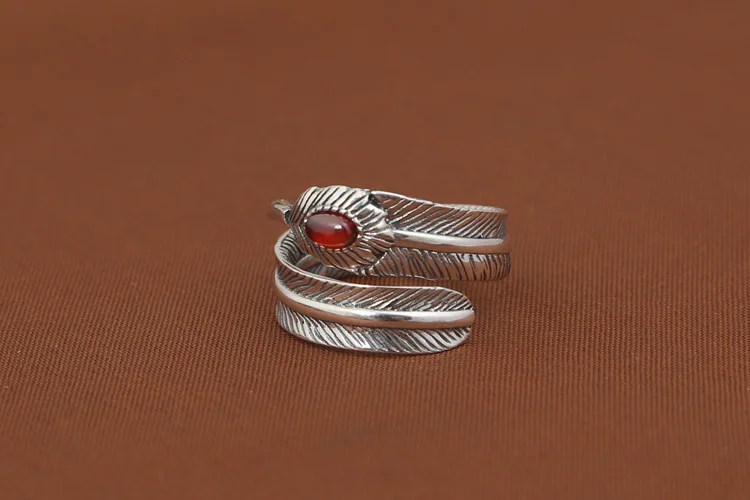 Best Solid Silver 925 Feather With Red Stone Cuff Ring Men Women Tail Band Vintage Indian Style Retro Si