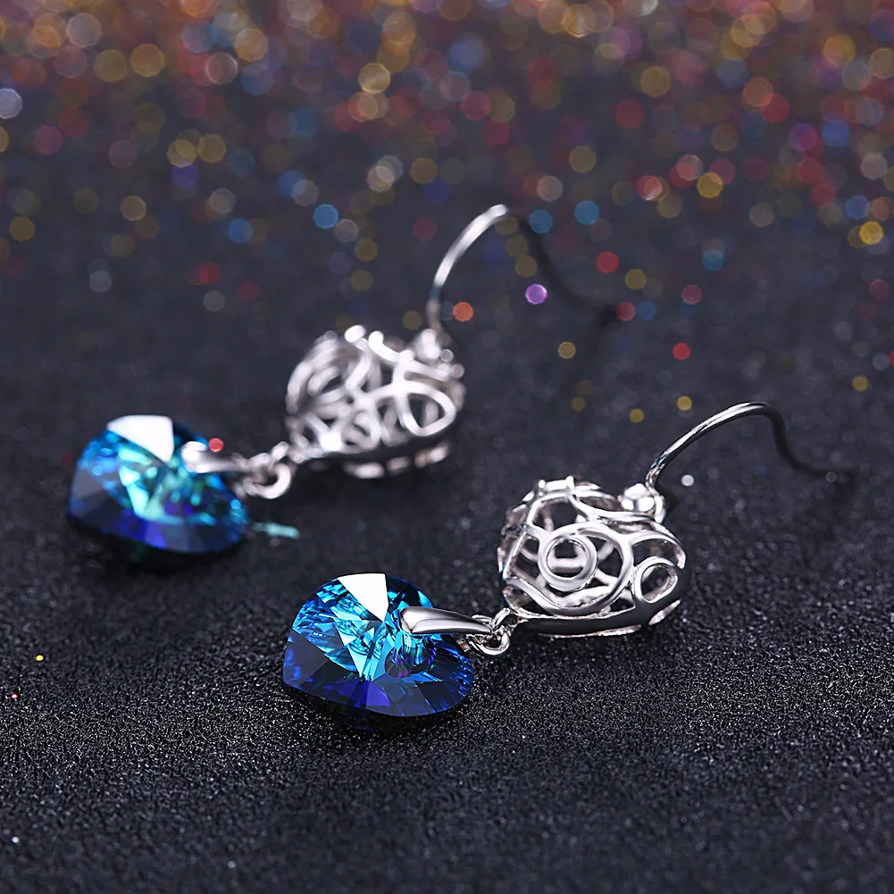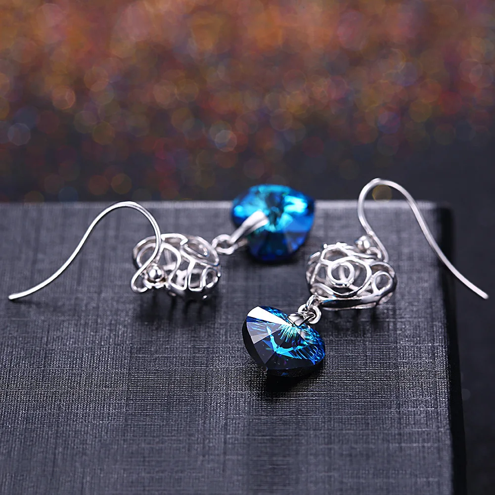 Fine Jewelry Made with Love heart Blue Austria Crystal Drop Earrings Real S925 Sterling Silver Long
