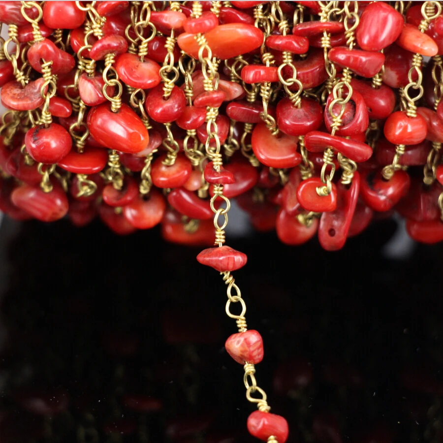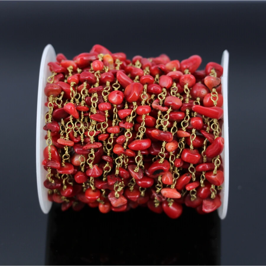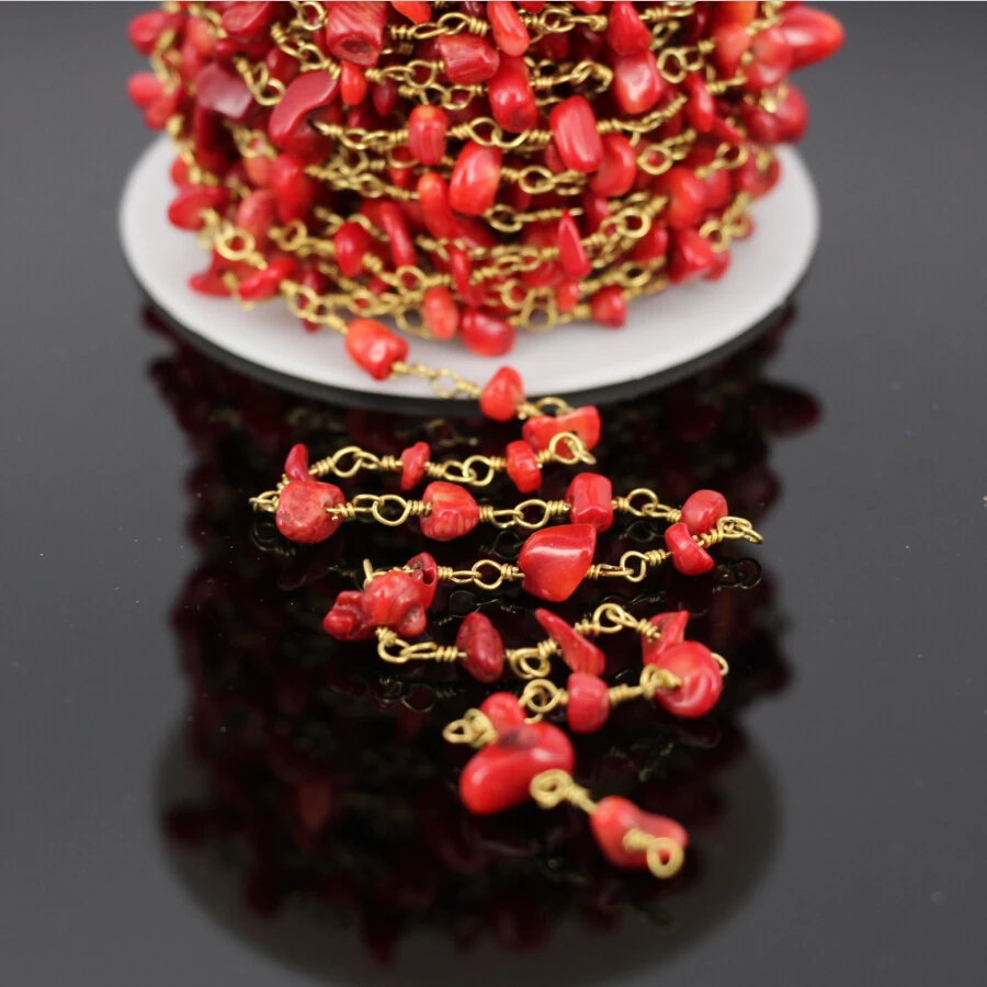 ORIGINAL 5Meter Red Coral Nugget Chip Beads Link Rosary ChainGold Plated Wire Wrapped Chains Necklacefashion